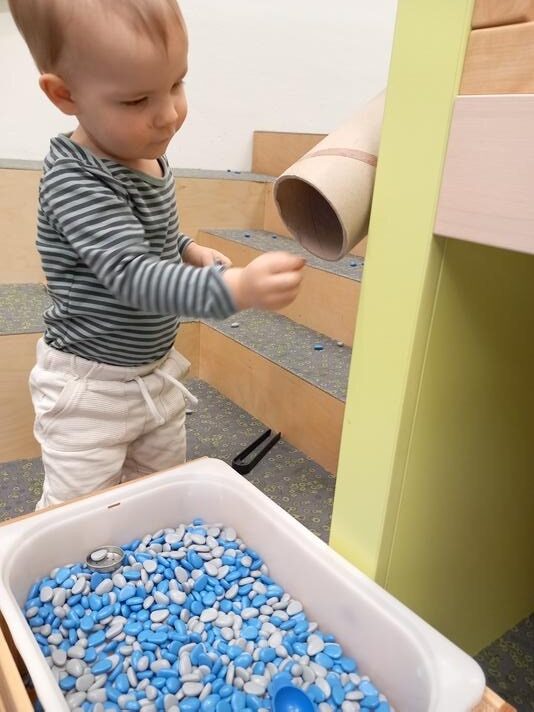 Ich arbeite mit den Bohnen. Ich setze mich in die Bohnenwanne und die anderen Kinder bedecken meinen Körper mit Bohnen. Ich spüre das Gewicht der Bohnen, die nun auf meinem Körper liegen.