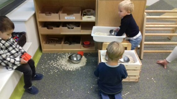 Wir machen Sinneserfahrungen mit der Bohnenwanne. ,,Schütten, schöpfen und fühlen” ,,Übungen des täglichen Lebens” – wir lernen dabei Dinge, die wir im Alltag gebrauchen können.