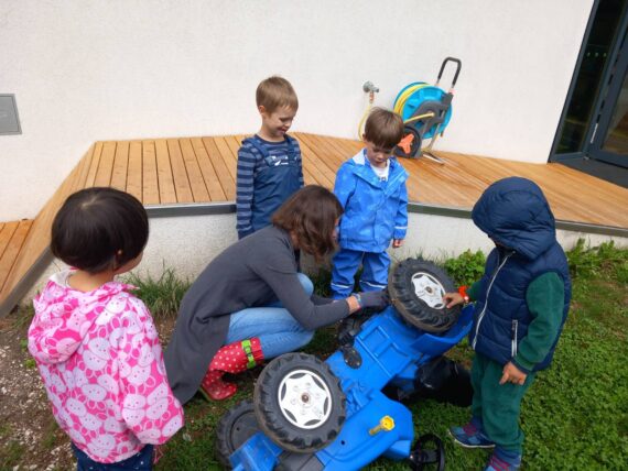 Wir reparieren unseren Traktor. Die Pedale haben durchgedreht. Die Deckel auf der Unterseite wurden aufgeschraubt und dann musste die Ursache gefunden werden. Die Kette ist von den Zahnrädern gerutscht. Wir haben sie wieder eingehängt und nun läuft unser Traktor wieder einwandfrei. Die Kinder lernten dabei: Nicht alles muss gleich weggeworfen werden. Manches lässt sich reparieren.