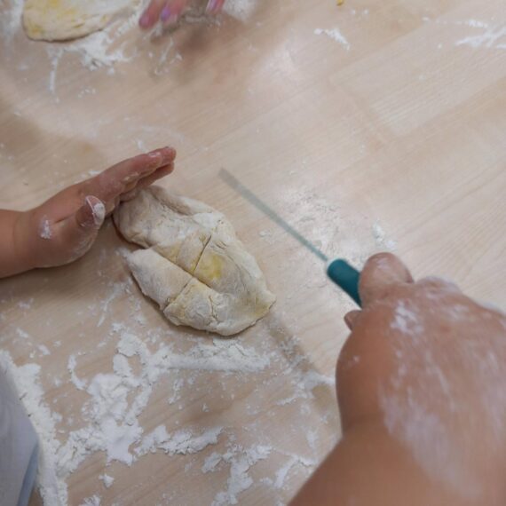 Wir dürfen den Teig kneten, formen und selber einschneiden.