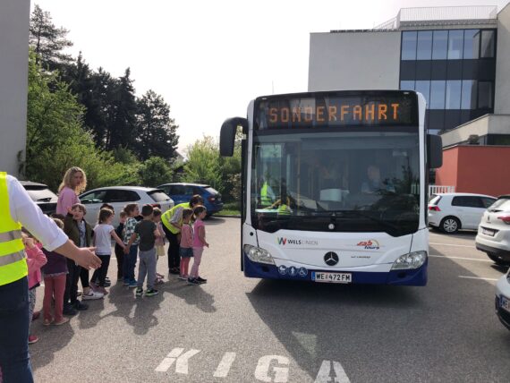 Bitte hinter die Linie treten. Der Schulbus fährt ein.