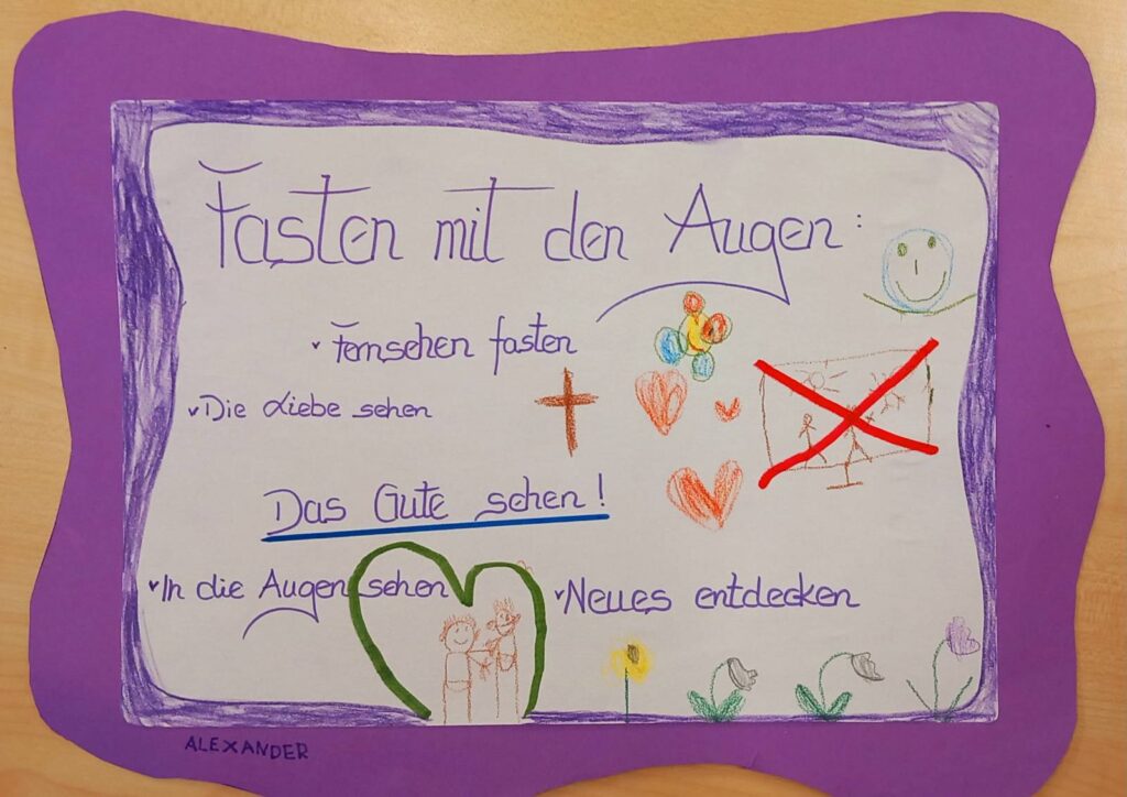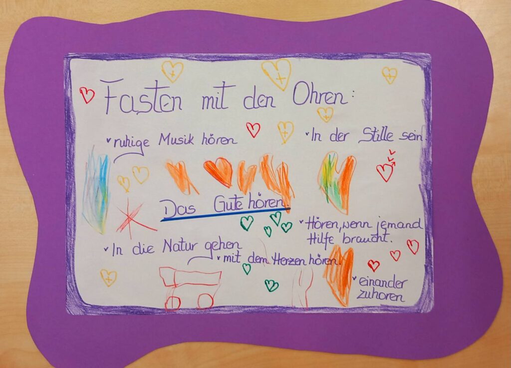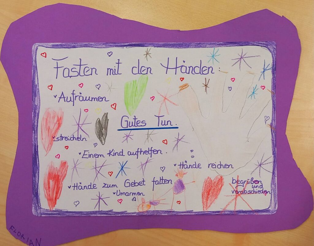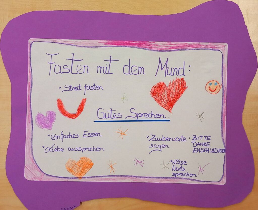 Die Kinder haben gemeinsam im MORGENKREIS unsere FASTENGEDANKEN erarbeitet und die Schulanfänger haben es in Bildern festgehalten.