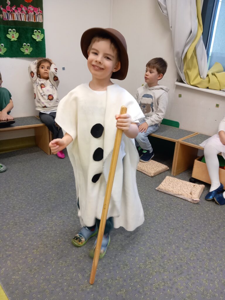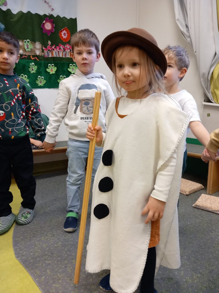 Wir spielen ein Kreisspiel und verkleiden uns als Schneemann.