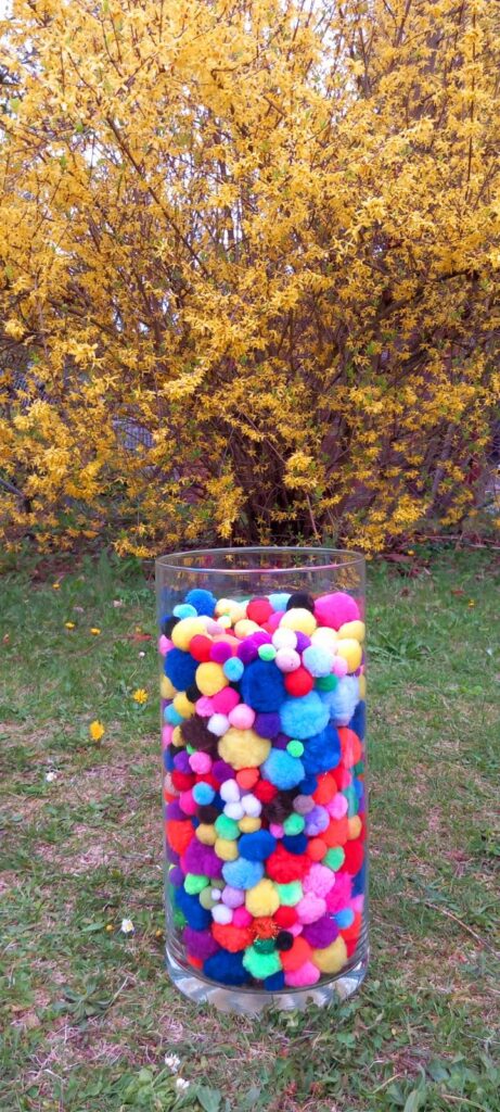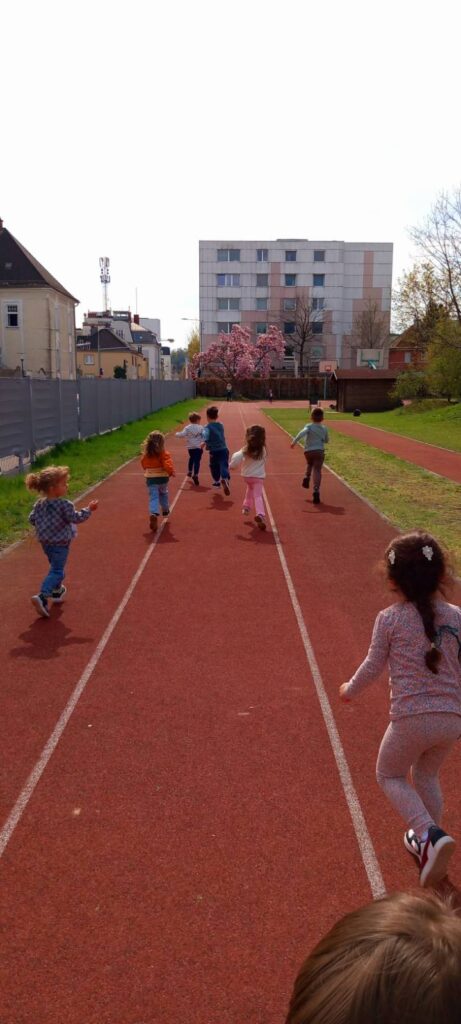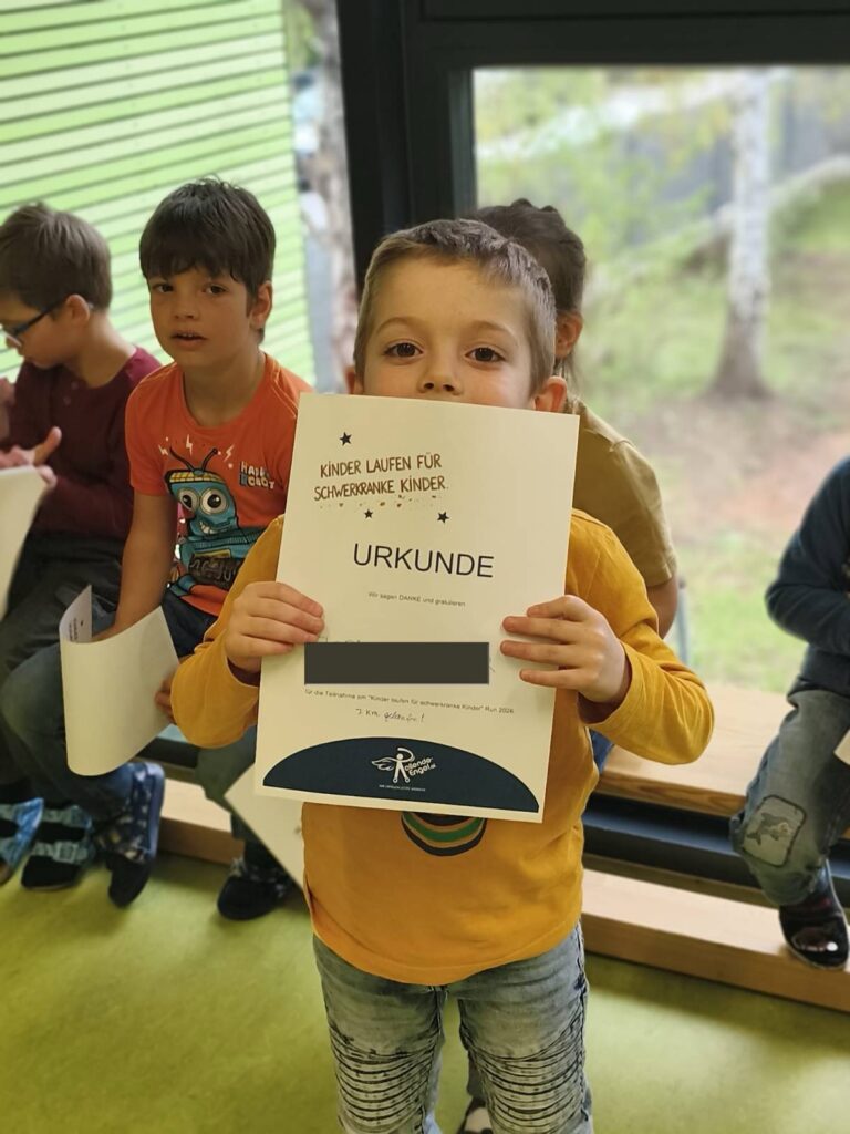 Wir laufen mit großer Begeisterung, sammeln für jede gelaufene Bahn im Schulgarten einen bunten Pompom und füllen damit eine große Vase aus Glas. Für unsere Leistung bekommen alle Kinder eine Urkunde verliehen.