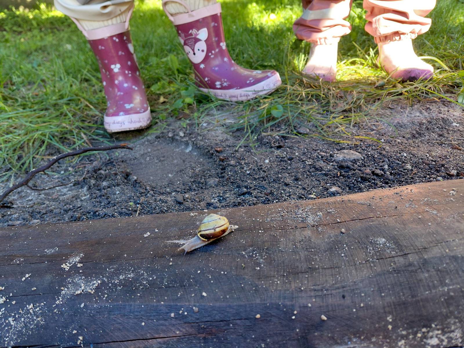 Wir haben eine Schnecke entdeckt…als wir näher kommen, versteckt sie sich in ihrem Haus.Wir sehen ihre Fühler nicht mehr.